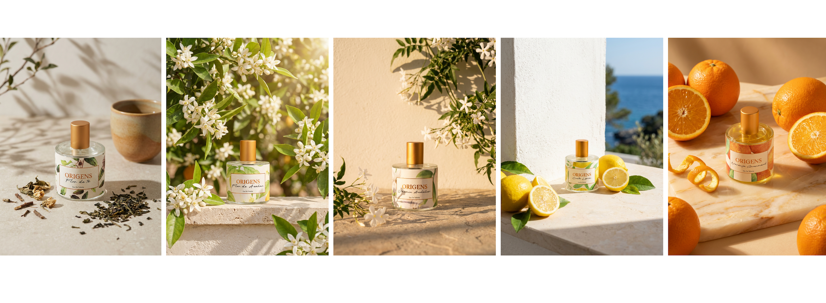 ORIGENS NACE DEL PAISAJE MEDITERRÁNEO: DEL AZAHAR EN PRIMAVERA, DEL LIMÓN RECIÉN CORTADO, DE LA NARANJA MADURA AL SOL Y DEL JAZMÍN AL CAER LA TARDE. UNA COLECCIÓN DE PERFUMES ARTESANALES QUE CAPTURA LA LUZ, LA FRESCURA Y LA CALIDEZ DE NUESTRA TIERRA.